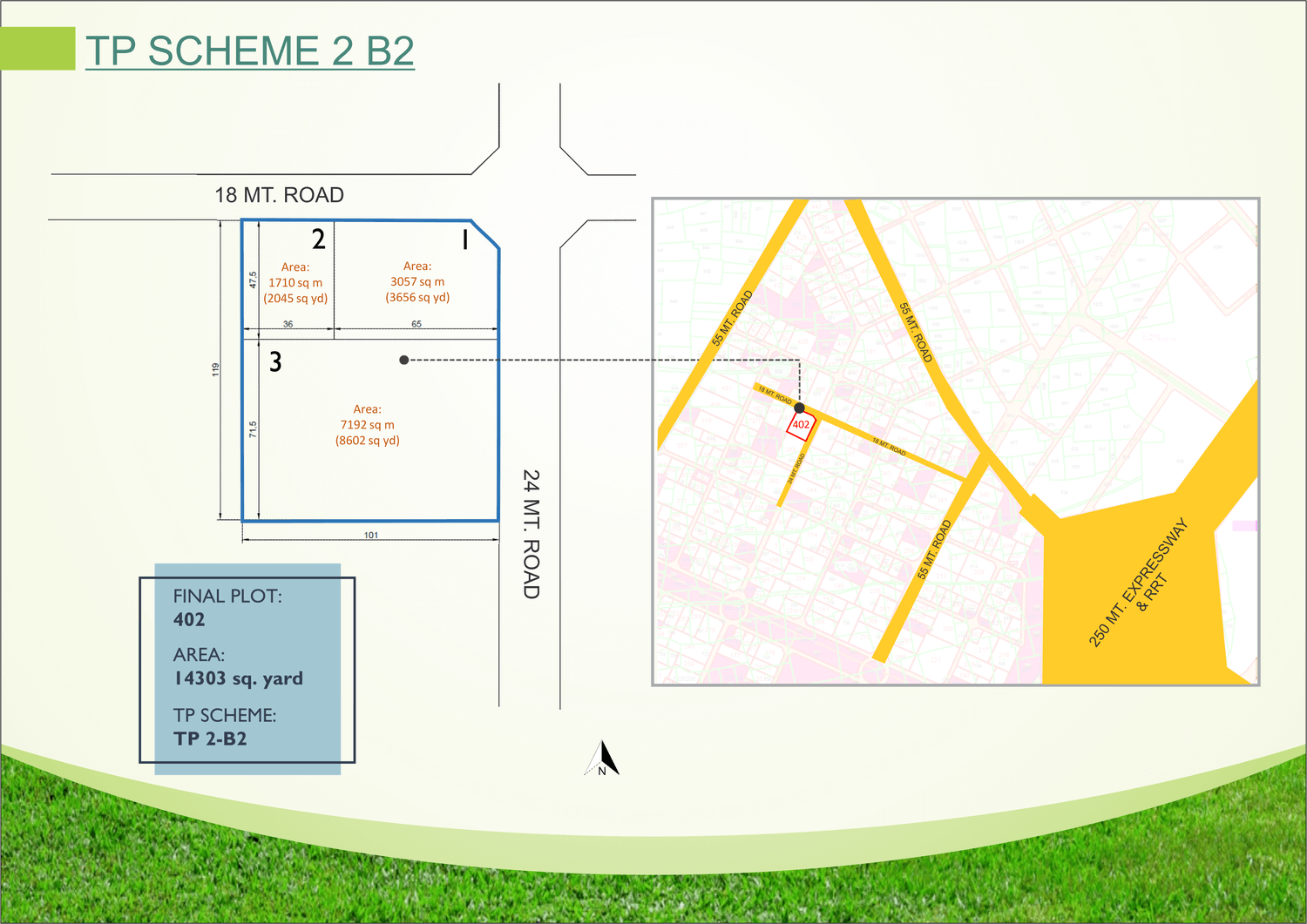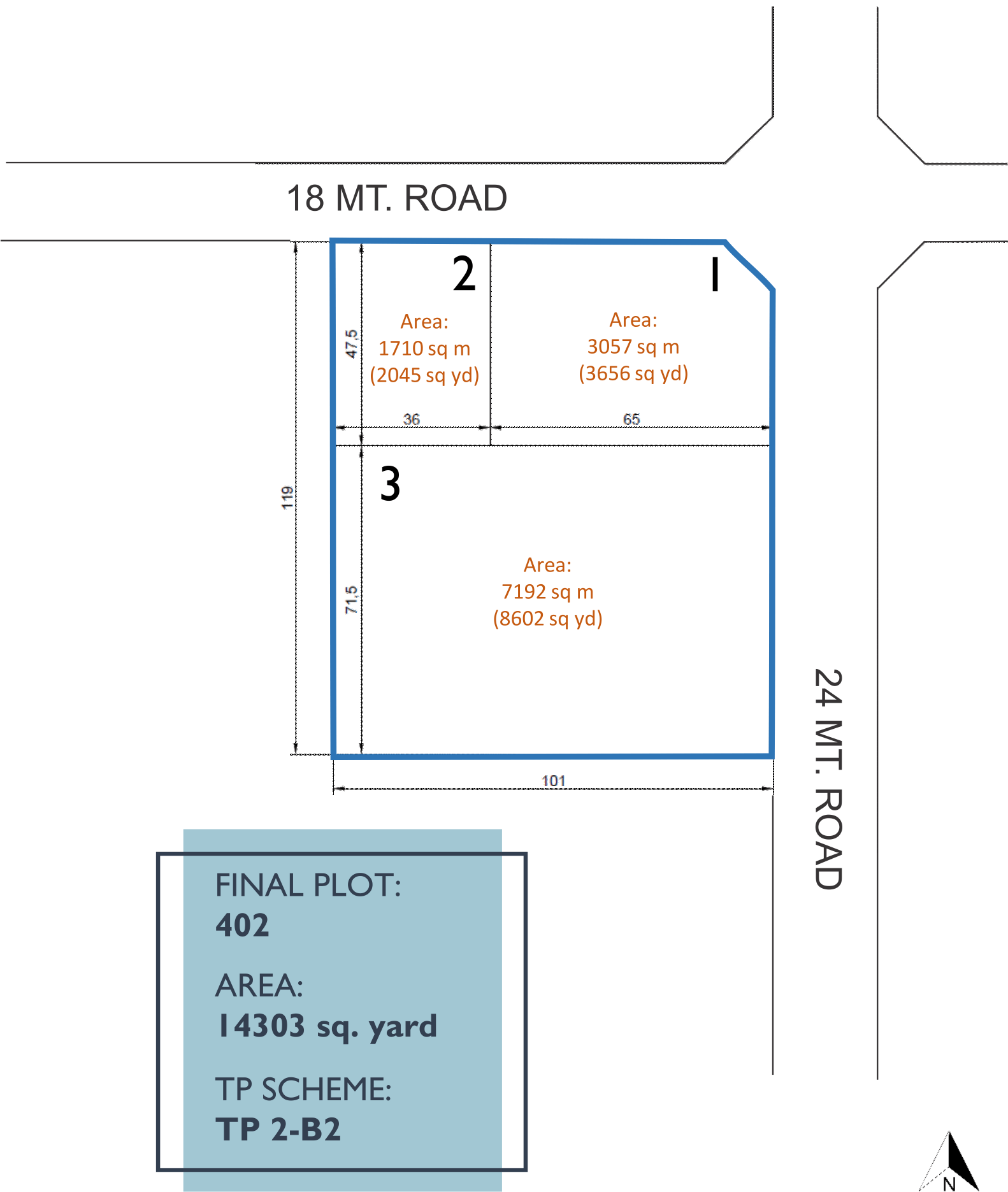 Commercial land FP 402 is in City Centre zone in Linear TP 2B2 on 18 and 24 Mtr TP road. It is just 800 Mtr from orange line metro route and close to 250 Ahmedabad Dholera Expressway. Land is NA, NOC, Title clear and ready for registration.